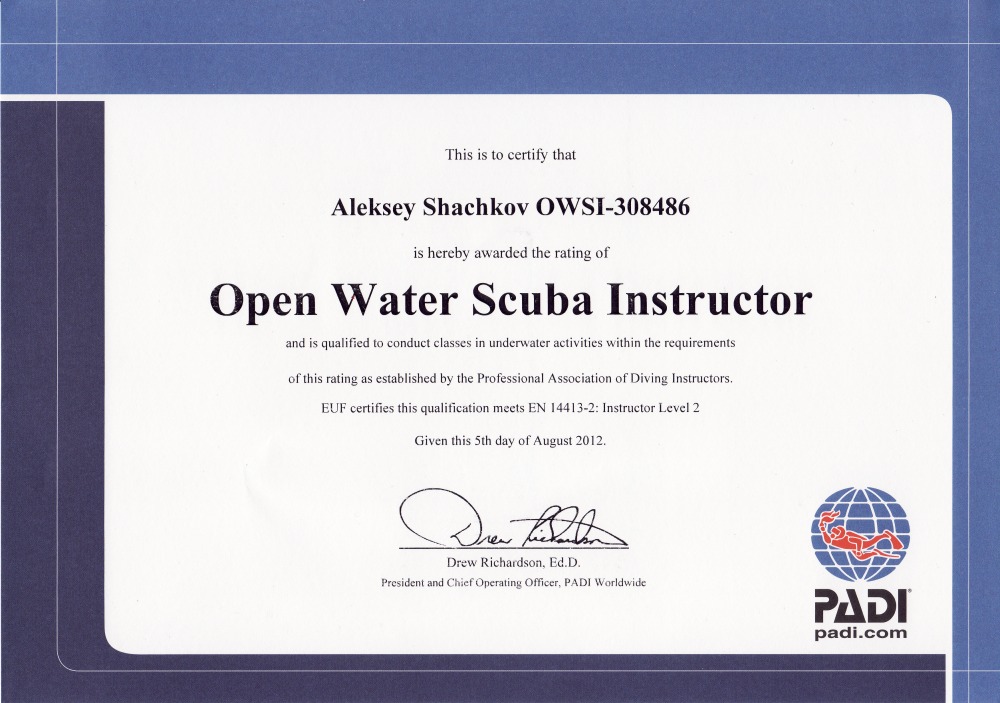 Инструктор PADI с 2012 года (Open Water Scuba Instructor #308486).